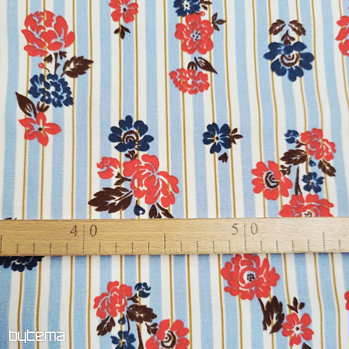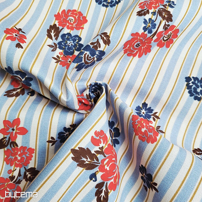 Látka s vyšším podílem bavlny a to 220g, s designem jemných modrých a červených květů se bude krásně vyjímat na dekoračním závěsu nebo ubrusu u vás doma. Jemné pruhy látce dodají na kráse.