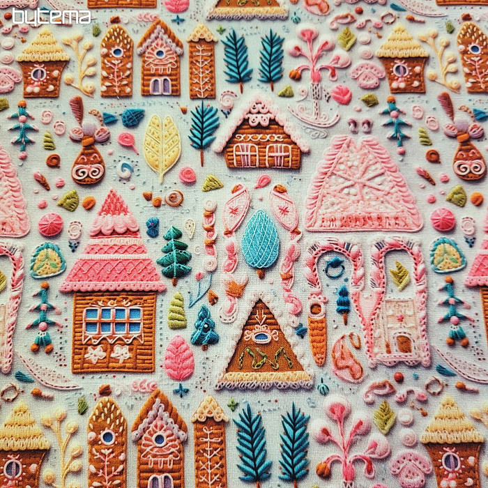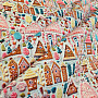 Bavlněná látka s perníkovými chaloupkami v krásných sytých barvách.