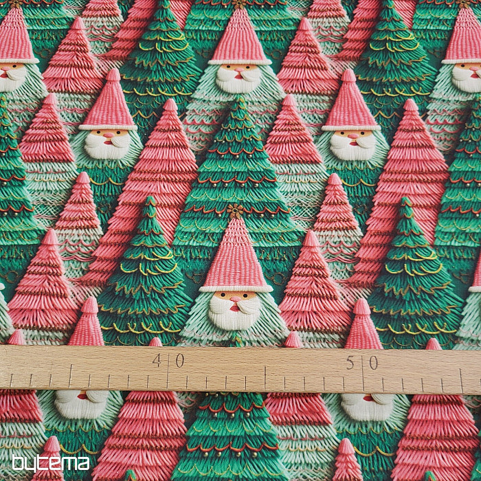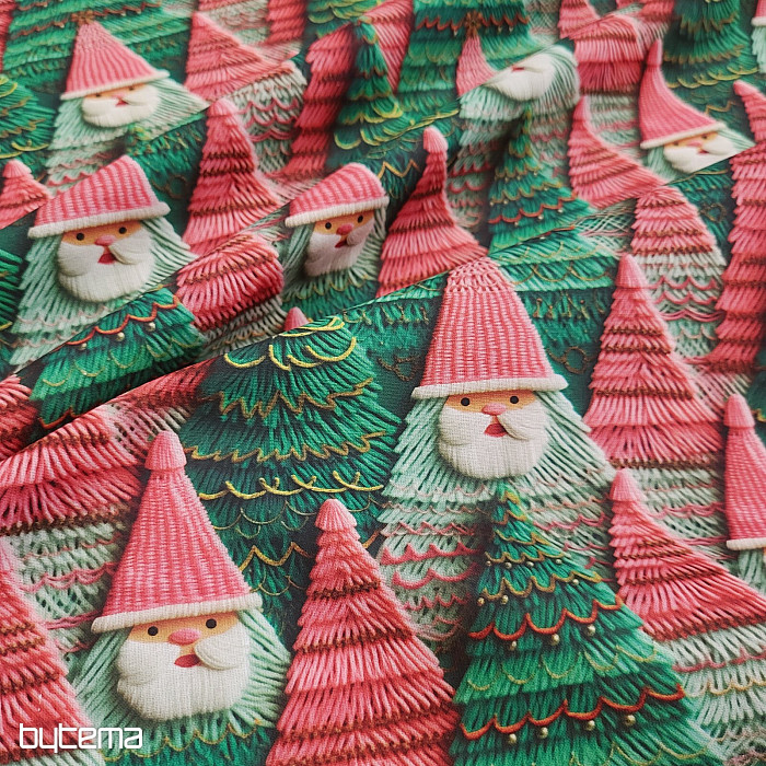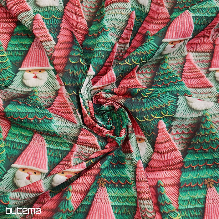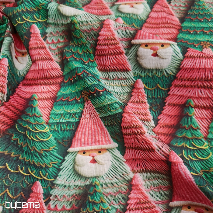 Vánoční dekorační látka s roztomilým obličejem skřítka Artura ztraceného v lese. Látka je vhodná k ušití ubrusů, závěsů i povlaků na polštáře.