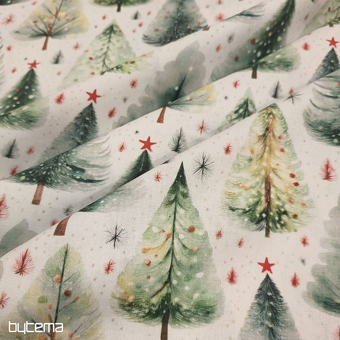 Vánoční bavlněná látka s digitálním potiskem stromečků, ze kterých vánoční atmosféra jen sálá.