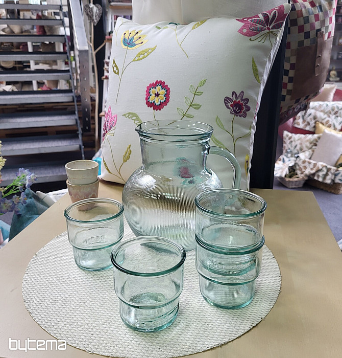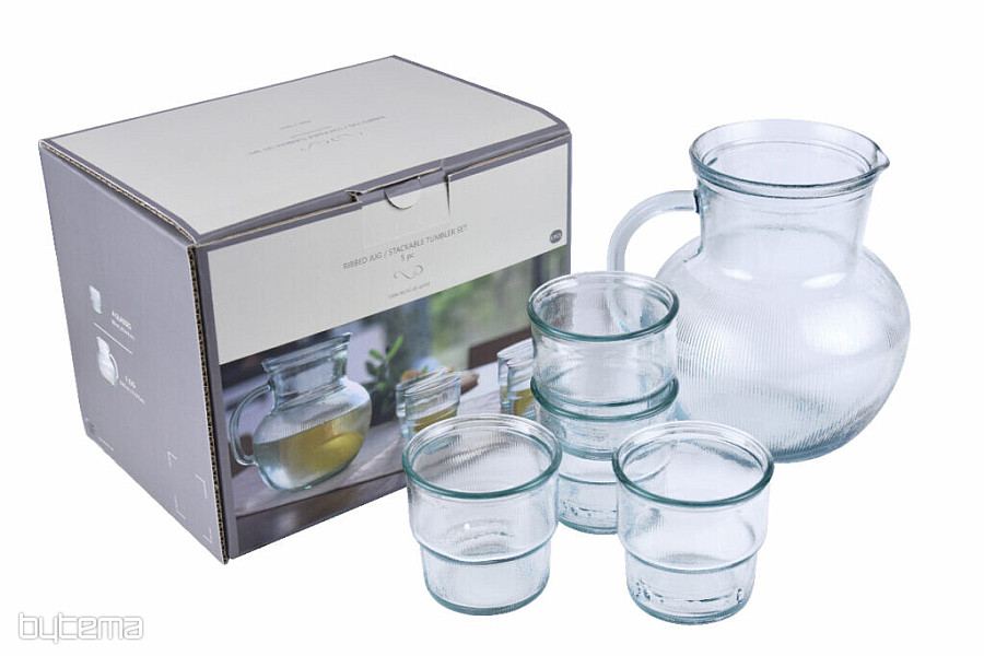 Krásný džbán a 4 kusy skleniček v dárkovém balení ze 100% recyklovaného skla. Sklo je čiré, průhledné. Vyráběno s ohledem na životní prostředí a styl vašeho domova.