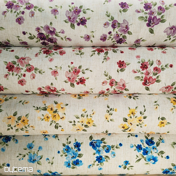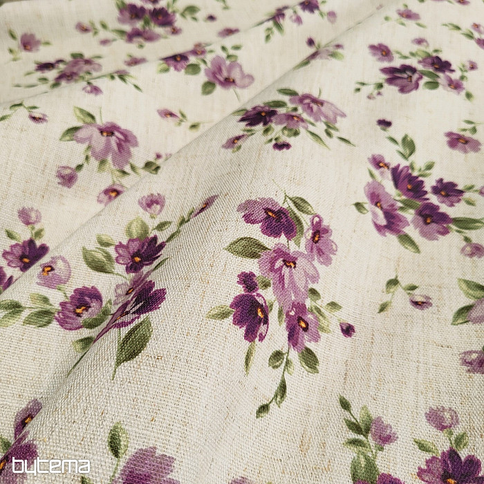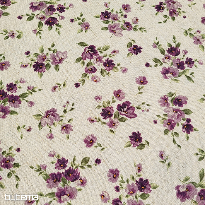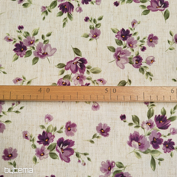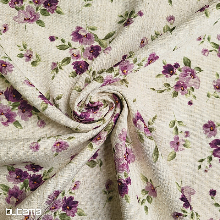 Dekorační látka s jarními květy v tmavě fialové barvě bude ozdobou vaší kuchyně i pergoly.