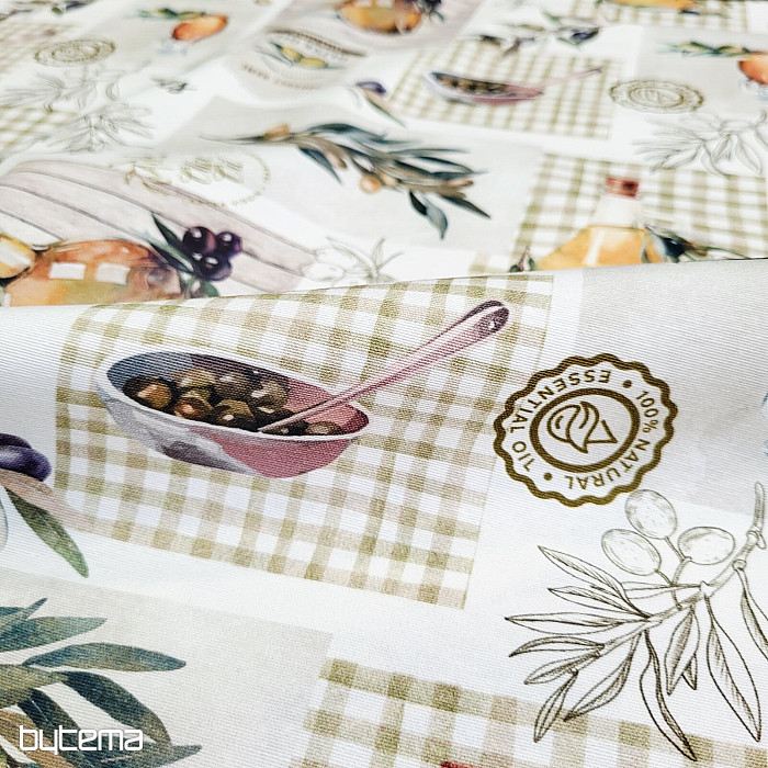Dekorační látka s motivem oliv působí svěže, středomořsky a hodí se do kuchyně, jídelny nebo na letní dekorace.