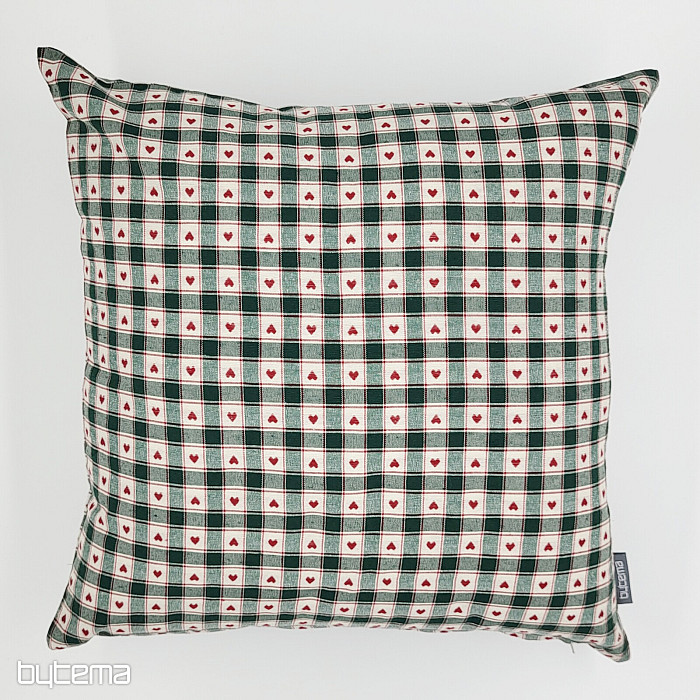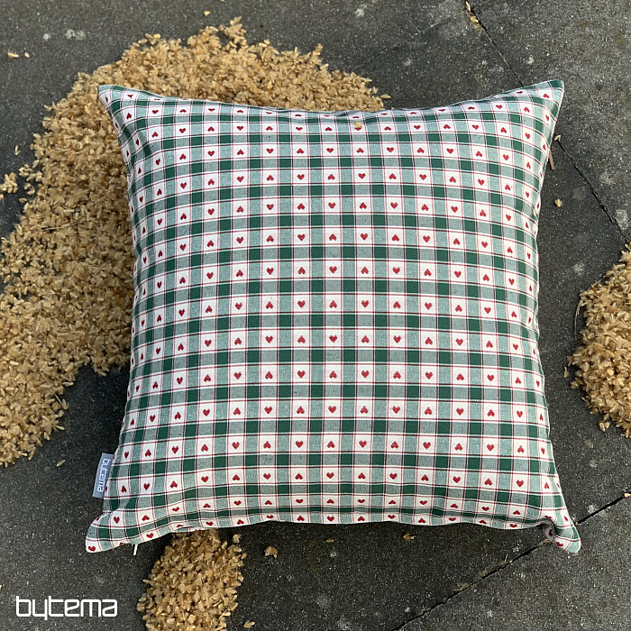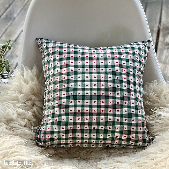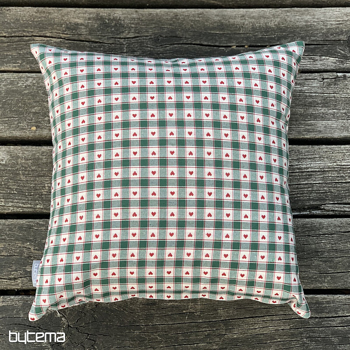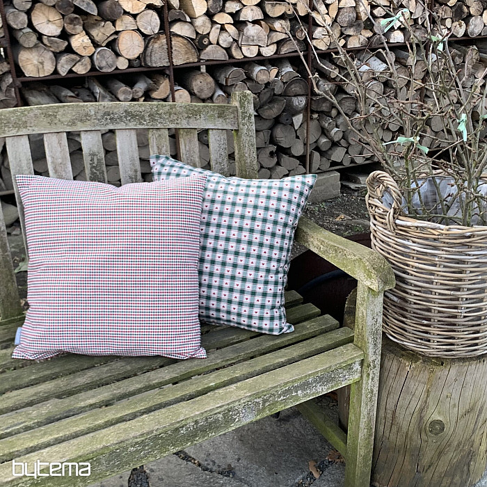 Dekorační povlaka na polštář v designu kára a srdíček se skvěle hodí do venkovských chaloupek a roubenek.