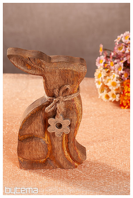 Dekorace na jarní svátky. Zajíček je velký 18 cm a je řemeslně zpracován z mangovníkového dřeva. Kolem krku má kovovou kytičku, která symbolizuje jaro, kdy všechno začíná kvést.