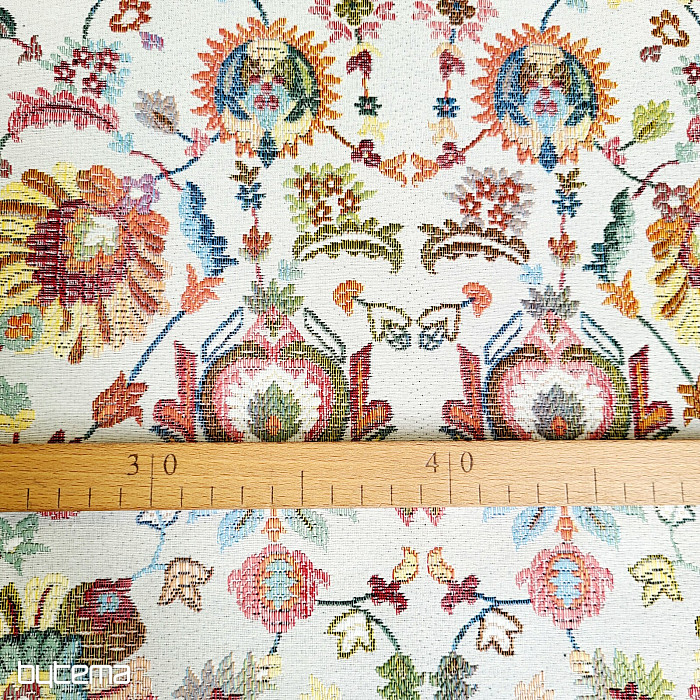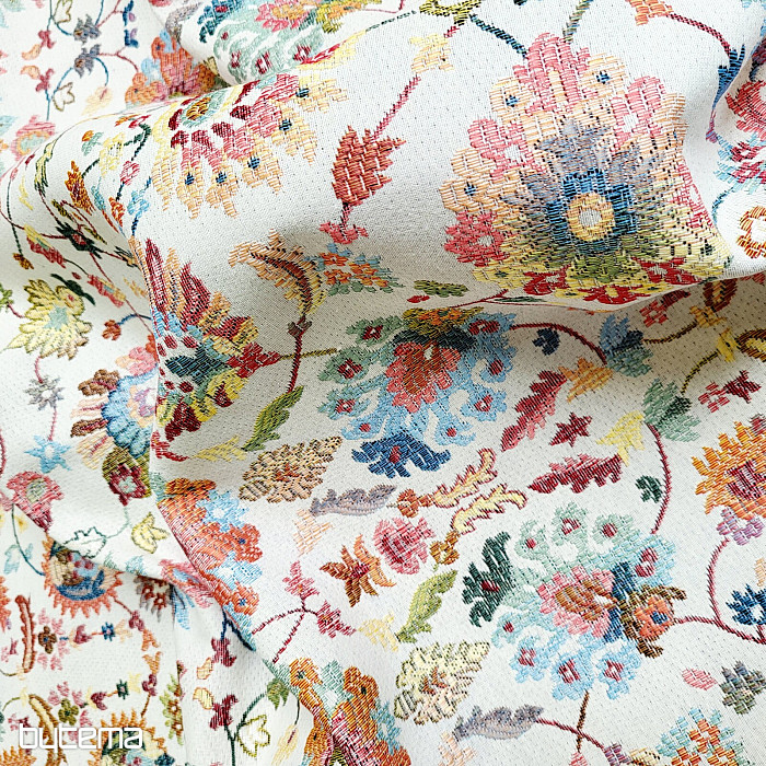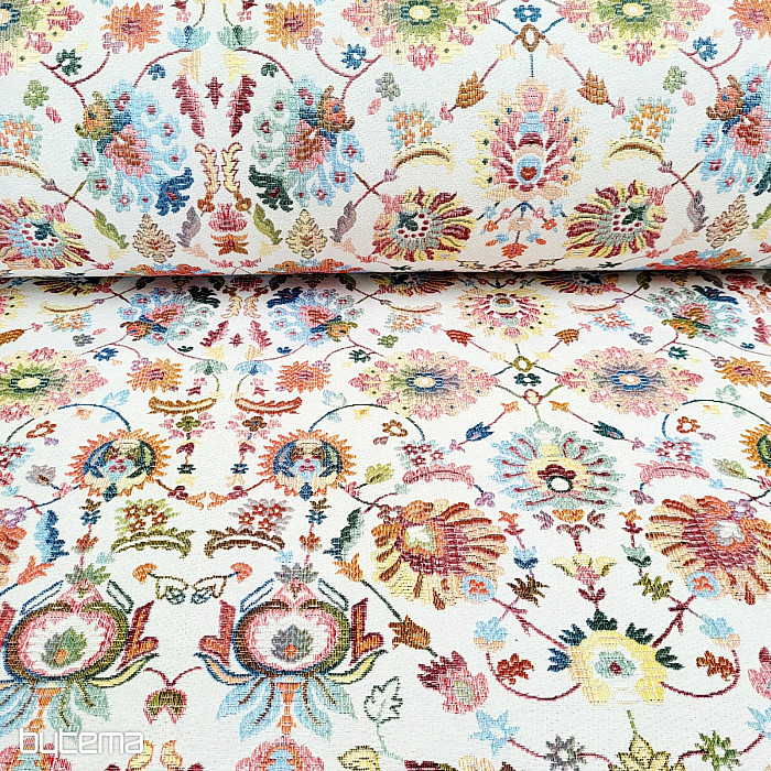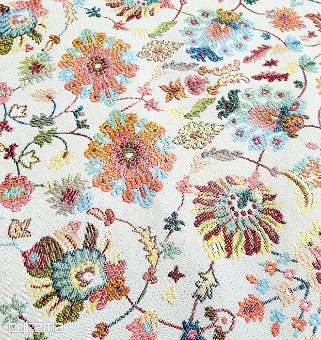 Gobelínová látka s výraznými indickými květy, které vytváří zajímavé ornamenty je naší novinkou na prodejně.