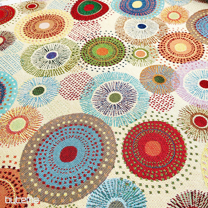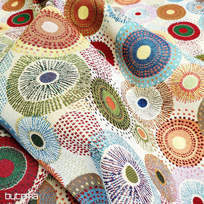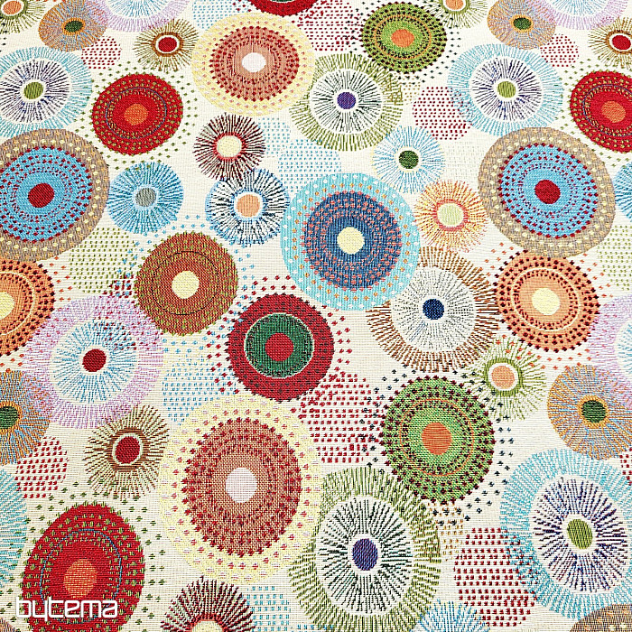 Gobelínová látka s barevnými koly mandal je naší novinkou na prodejně. Jemné, ale zářivé barvy látce dodají na eleganci.