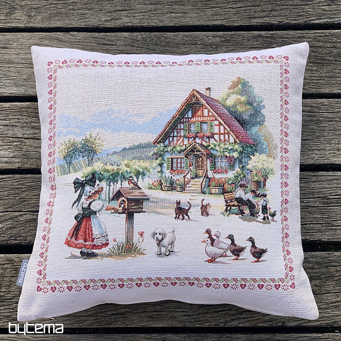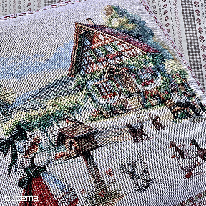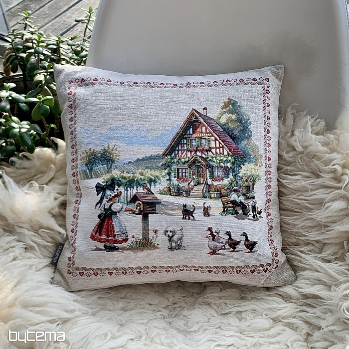 Gobelínový povlak na polštář s designem venkovského stavení a dvorkem plného zvířátek. Krásná a poetická dekorace do každé kdo má tuto scenérii rád.
