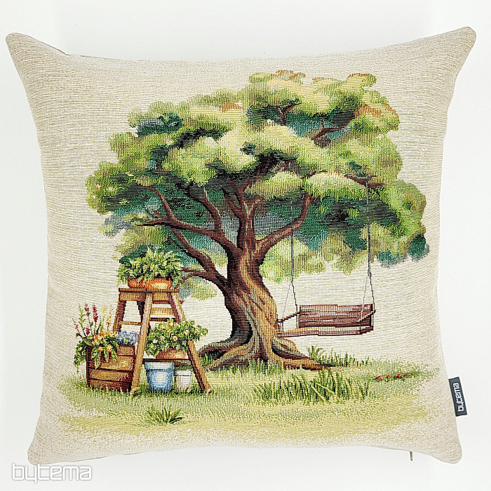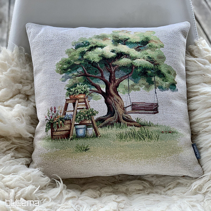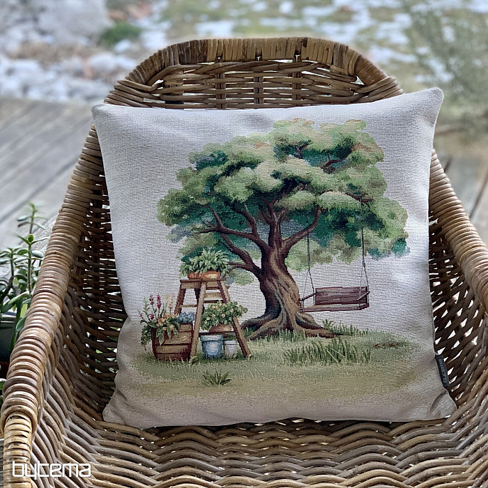 Gobelínový povlak na polštář s motivem relaxačního koutku. Houpačka pod korunou stromů je ideální k relaxaci.