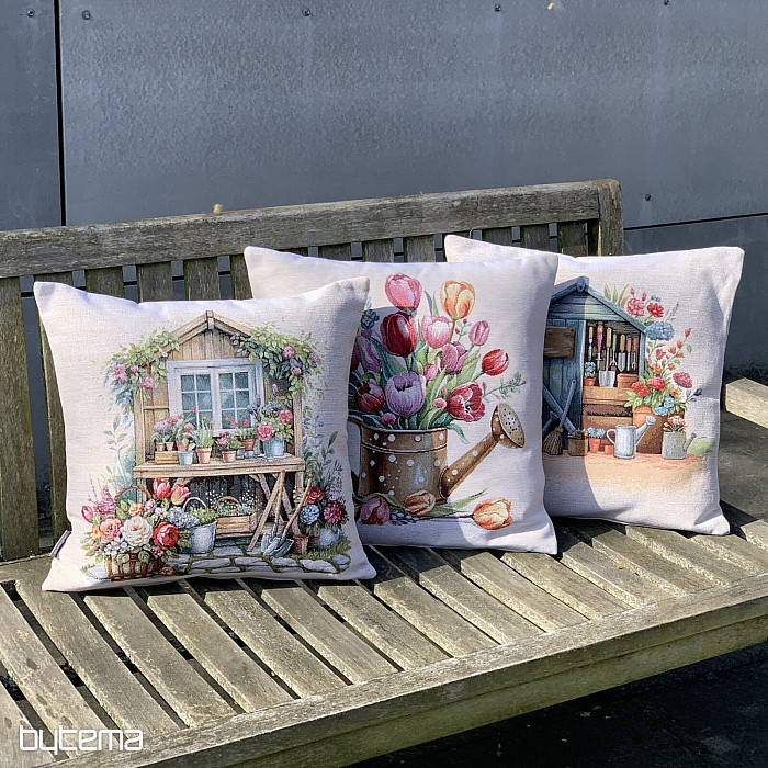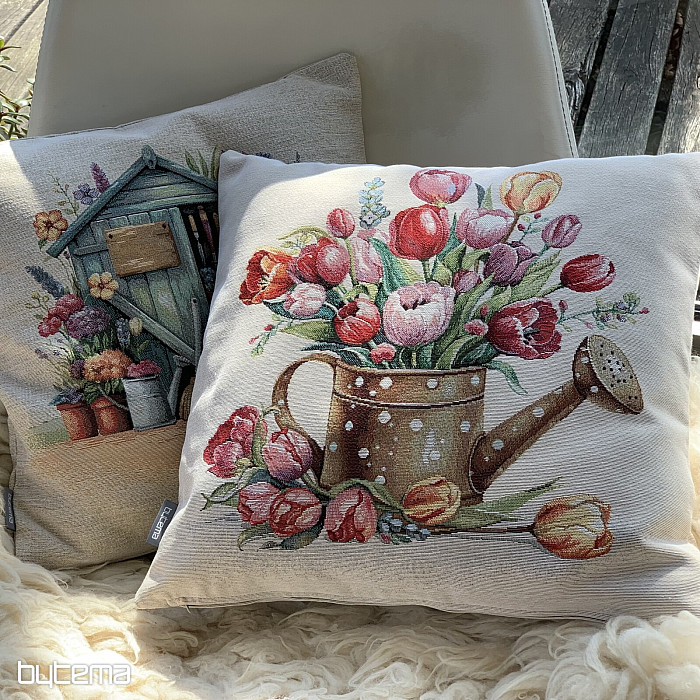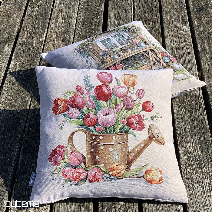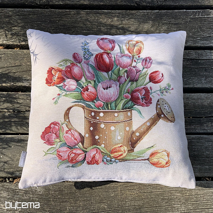Gobelínový povlak na polštář s jarní kyticí barevných tulipánů v konvičce. Krásná dekorace pro jarní čas u vás doma.