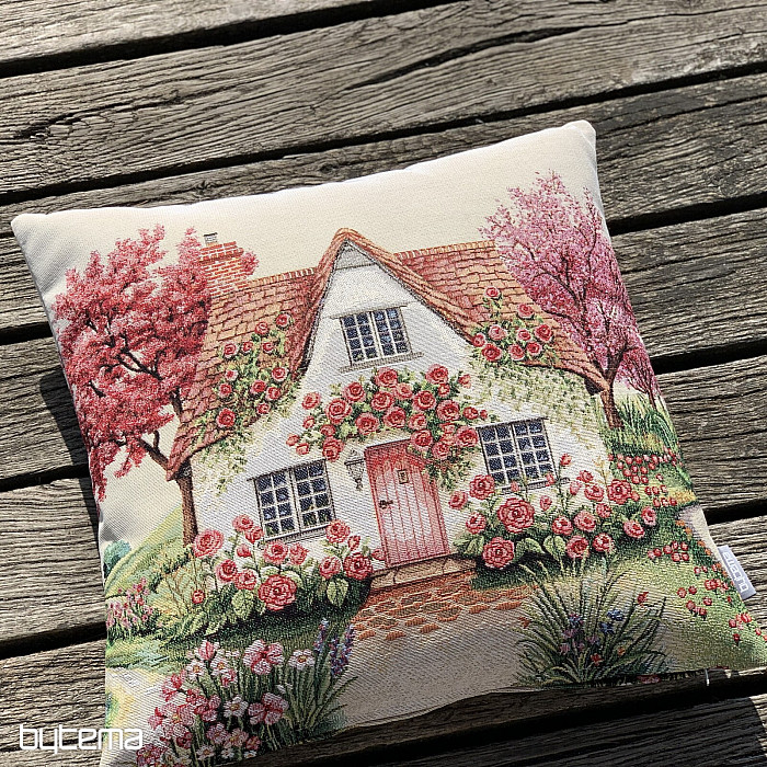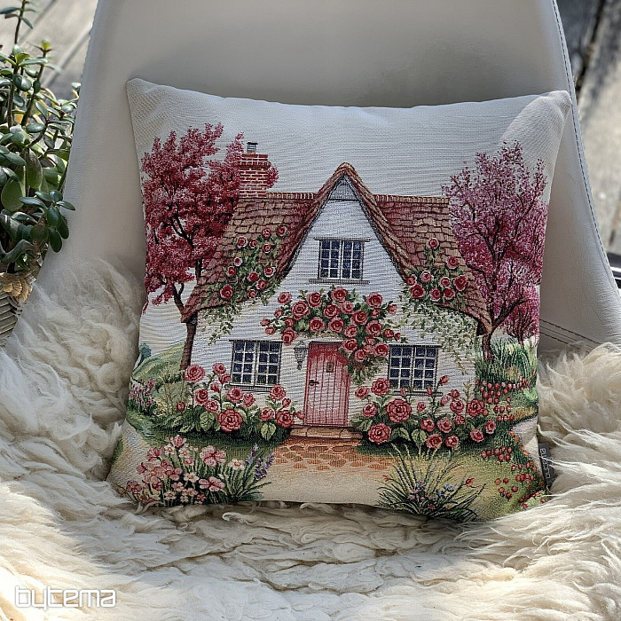 Gobelínový povlak s motivem venkovského domu obrostlého popínavnou růží.