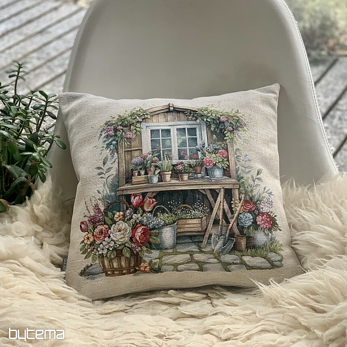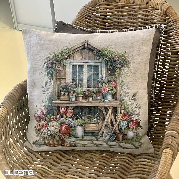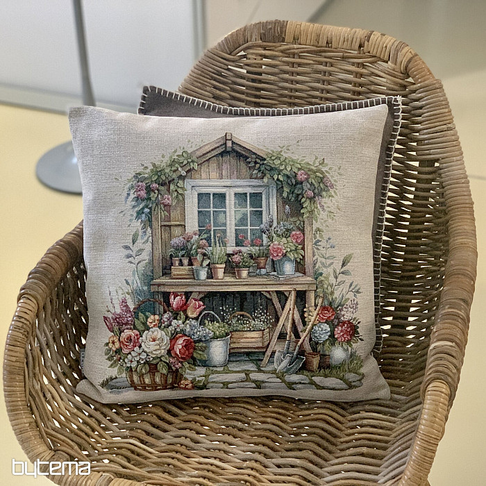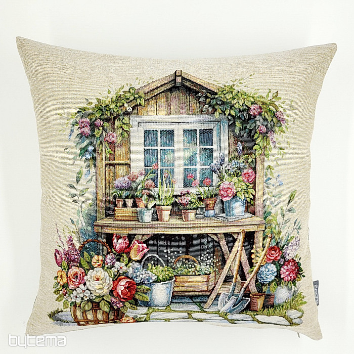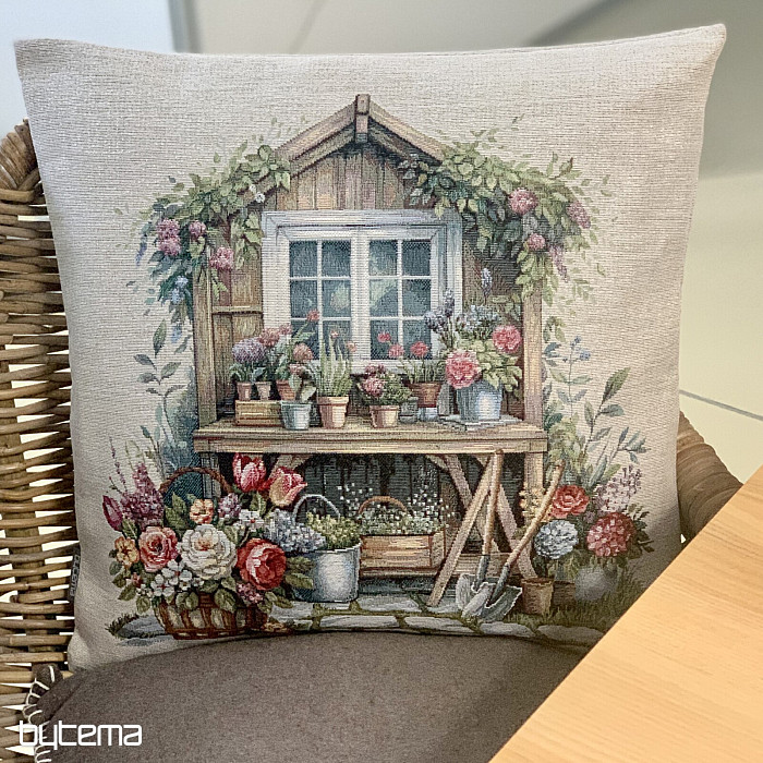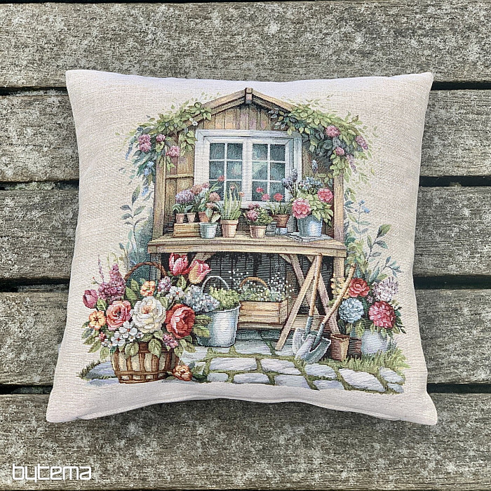 Gobelínový povlak na polštář se zahradním domečkem plným květin. Vzor na povlaku dýchá jarní pohodou a teplem.