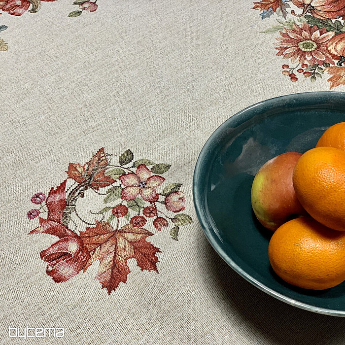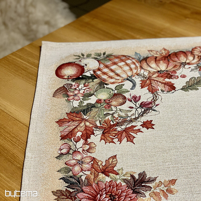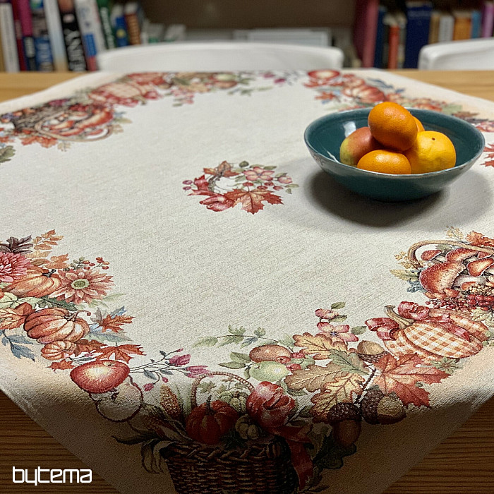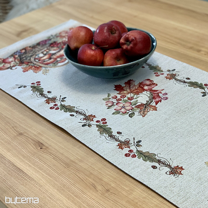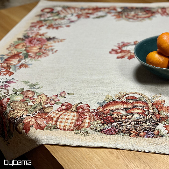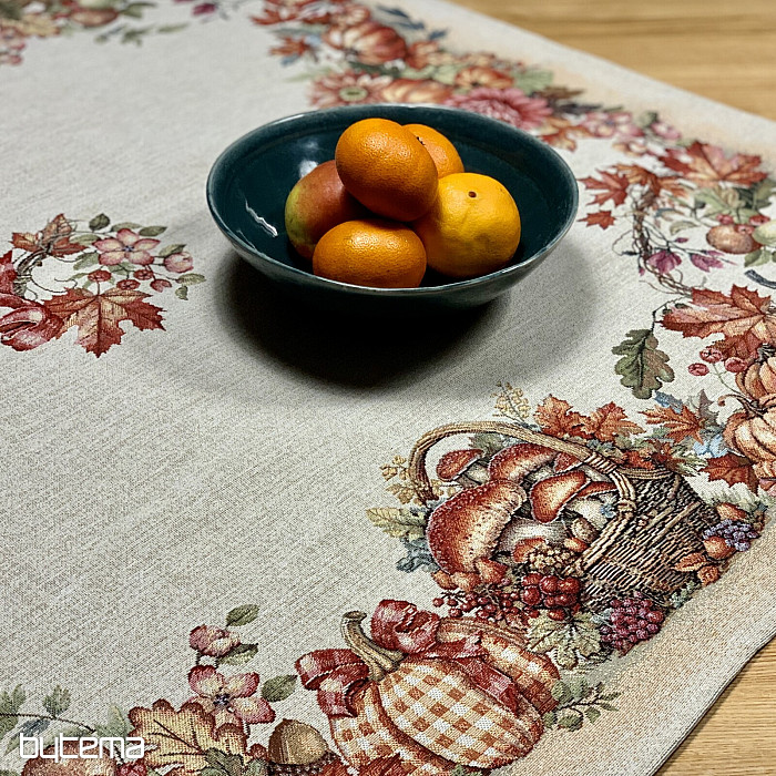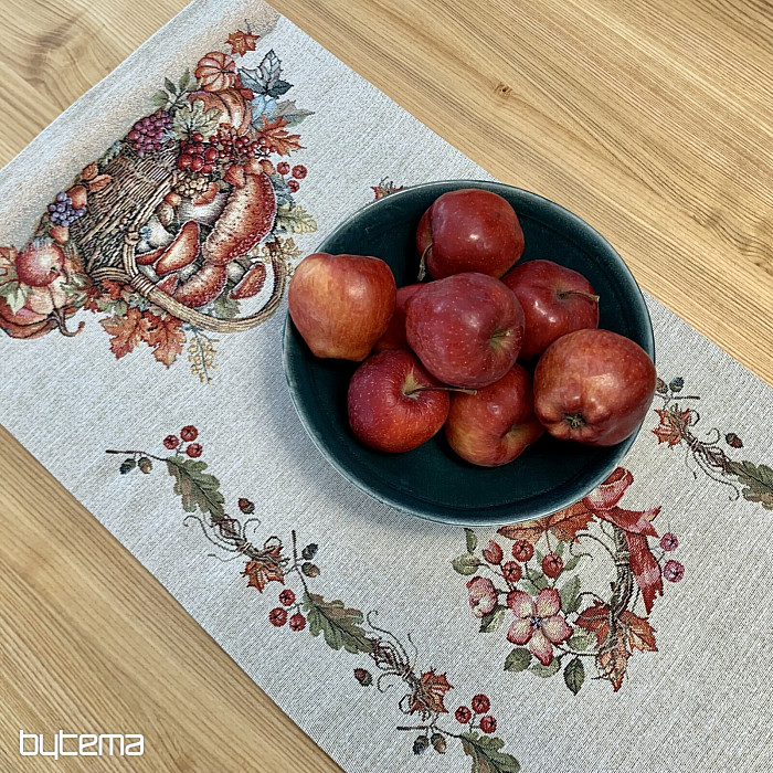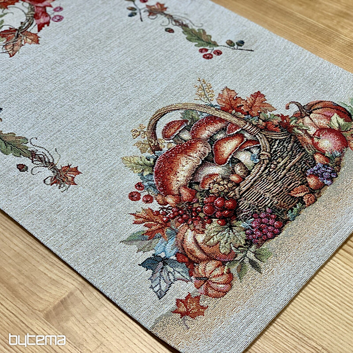 Gobelínový ubrus a šál se motivem ovocných plodů a hřibů, navodí příjemnou atmosféru.
