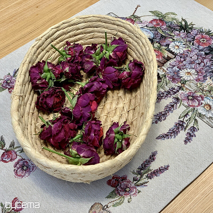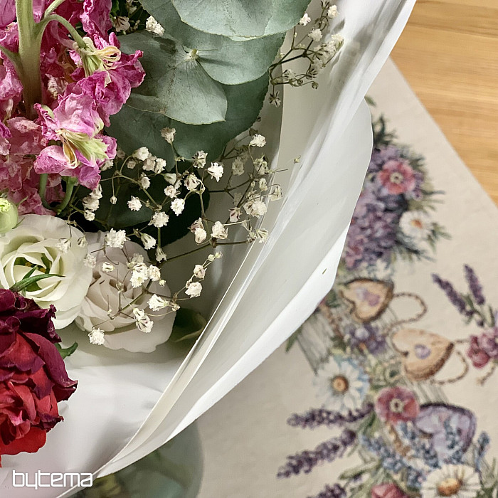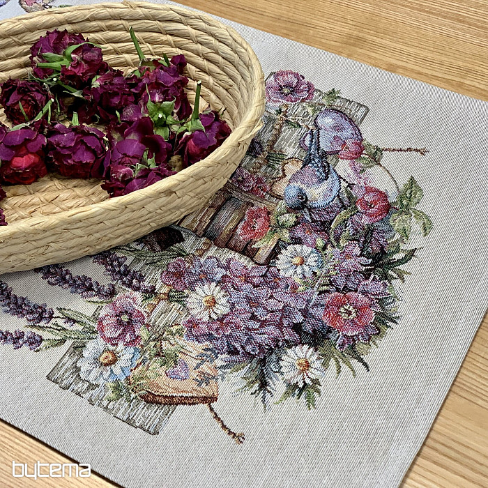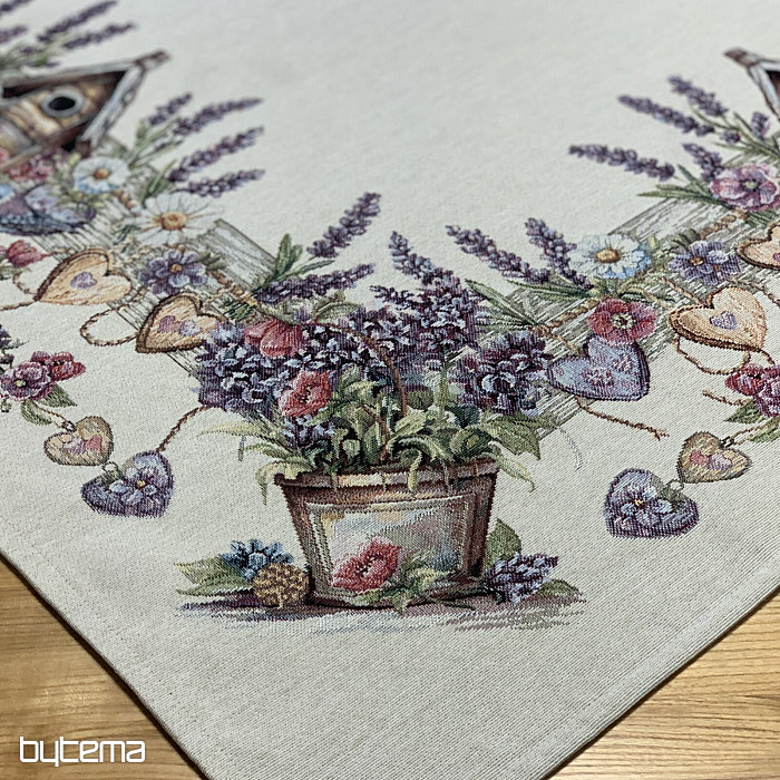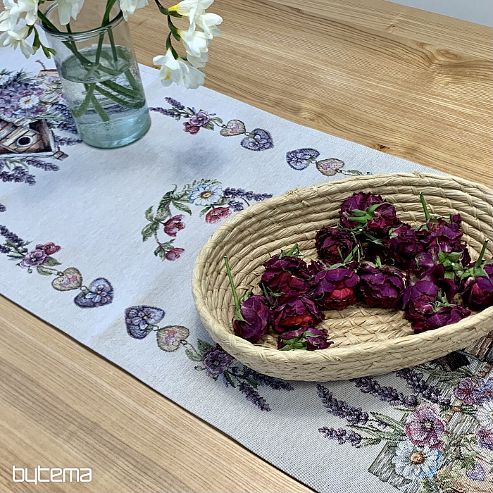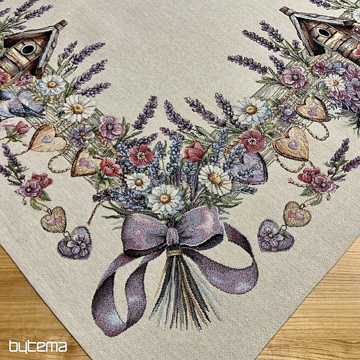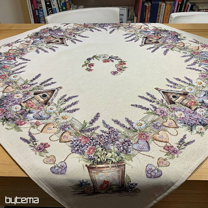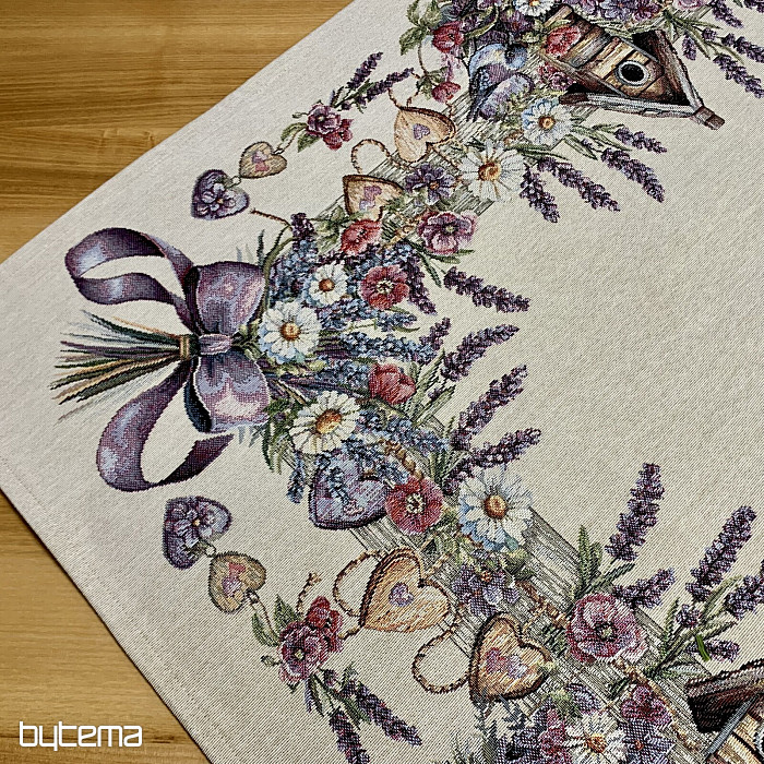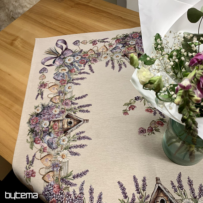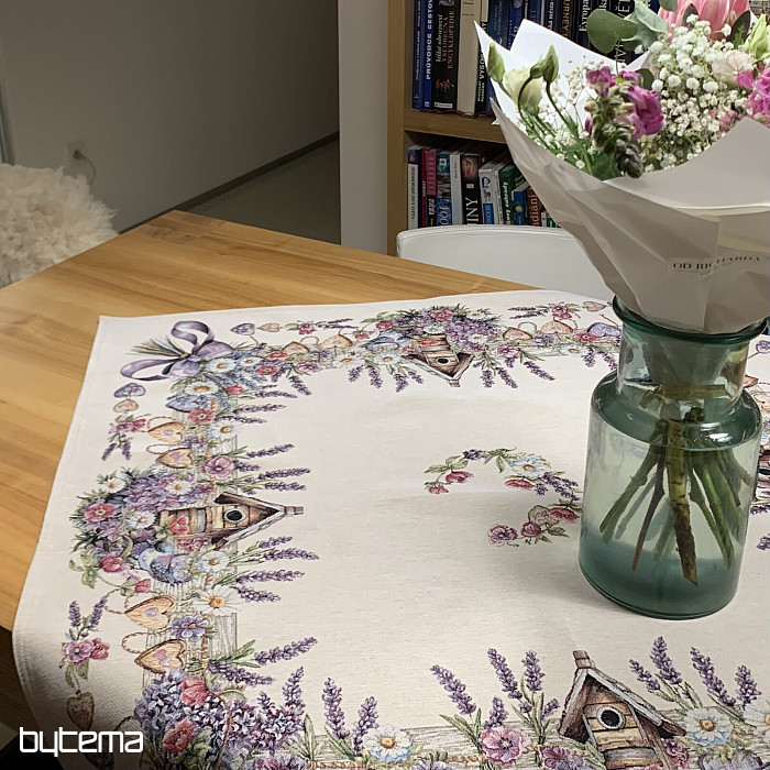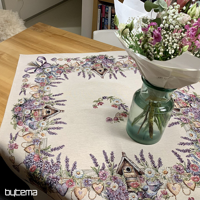 Gobelínový ubrus či šál s ptačí budkou, ptáčkem a jemnou levandulí. Krásný a jemný design vám bude dělat radost po celý rok.
