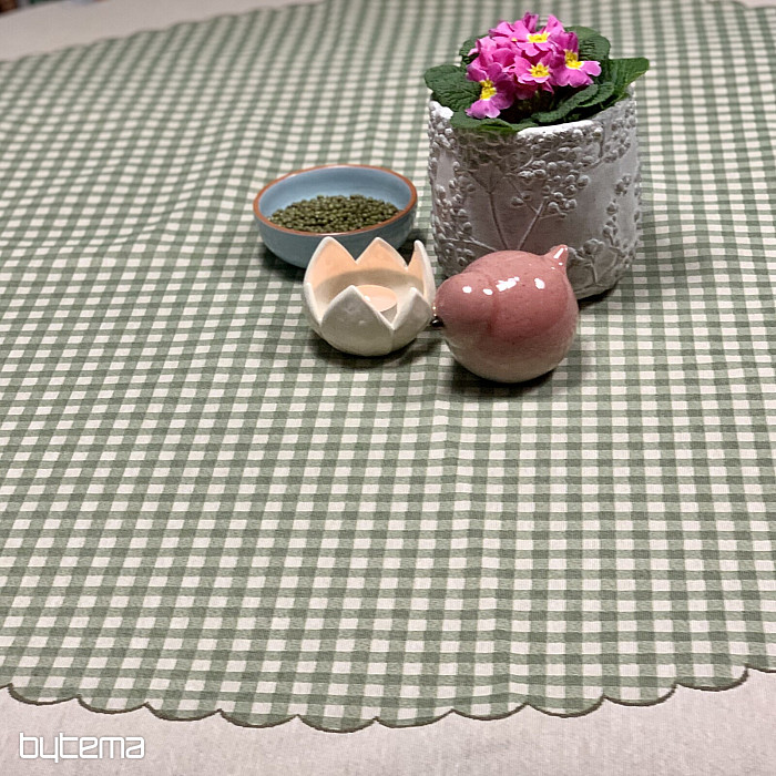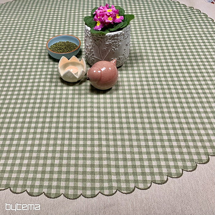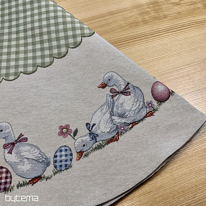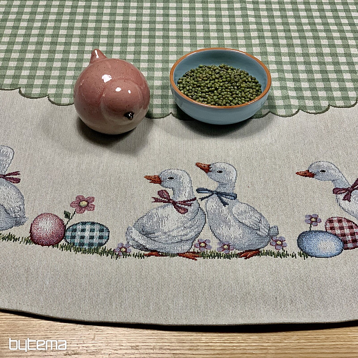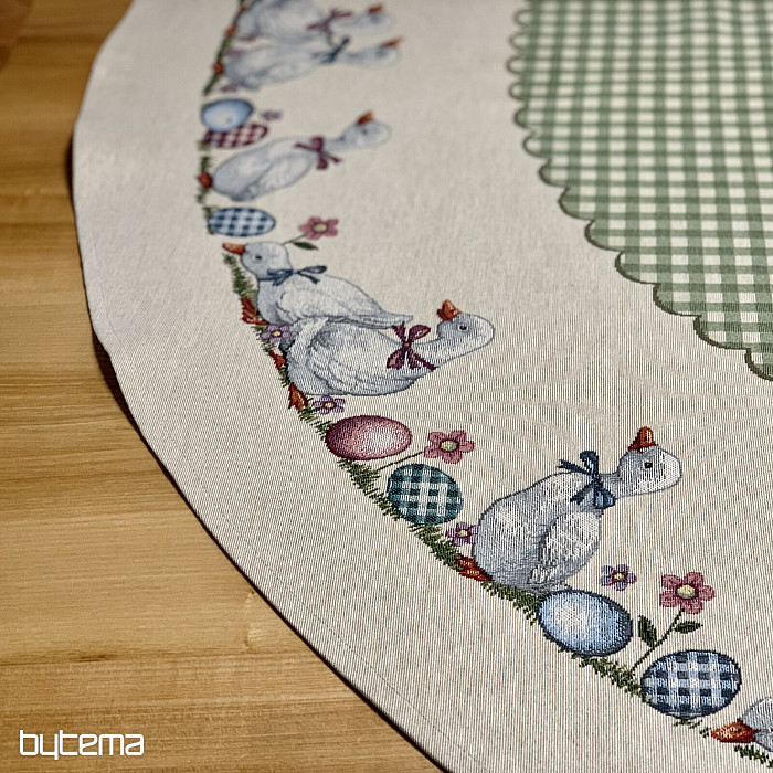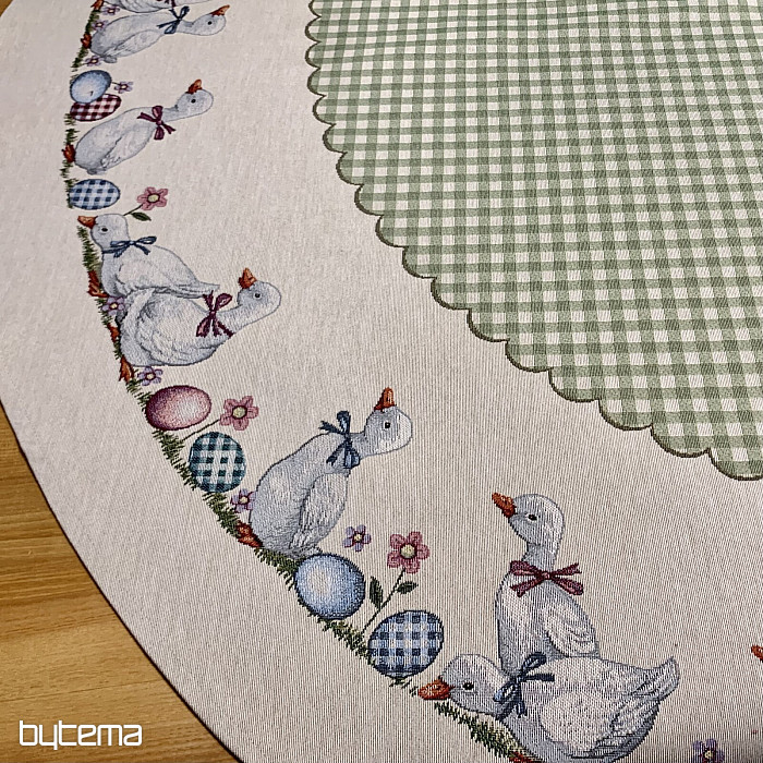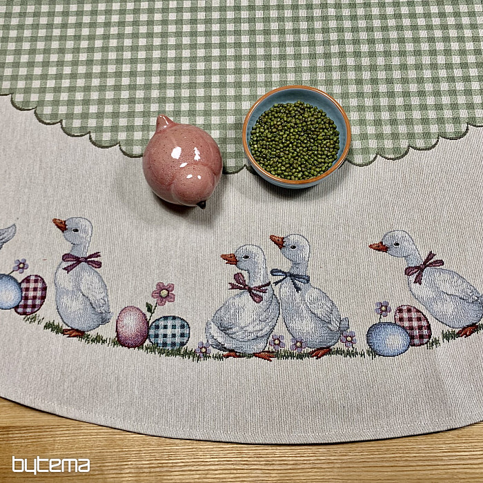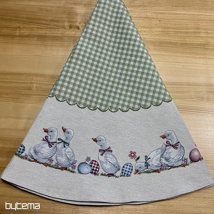 Velikonoční gobelínový kulatý ubrus se zeleným kárem a husičkami. Krásná dekorace pro váš kulatý stůl.