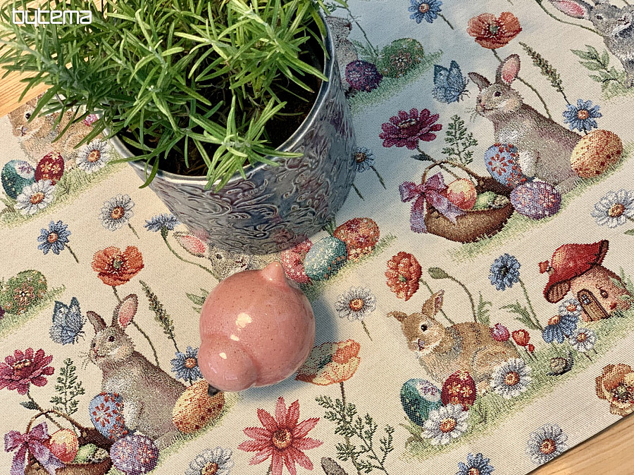 Gobelínový ubrus s motivem VELIKONOČNÍCH KRÁLÍČKŮ ozdobí každou kuchyni,chytu či chalupu.