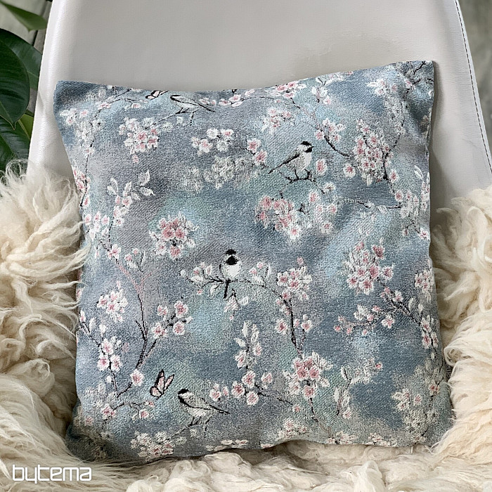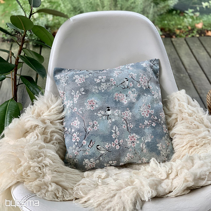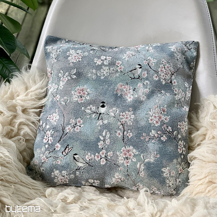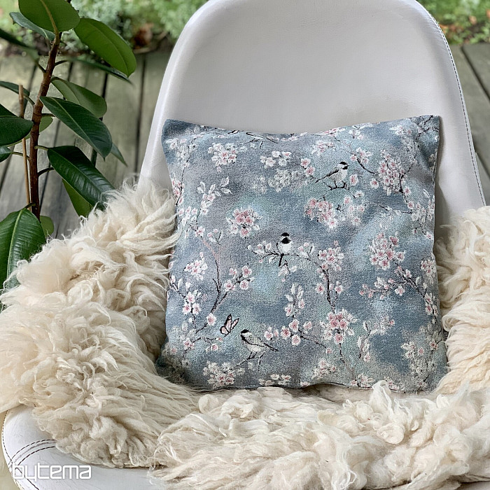 Luxusní kousek ze tkané dekorační látky s nádechem modrých odstínů a jemných sýkorek.