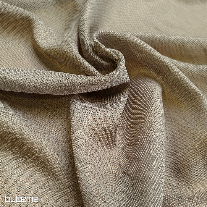 Záclona je jemná na dotek, ale hustě tkaná tmavě béžovou nití, jenž vytváří malé čtverce.