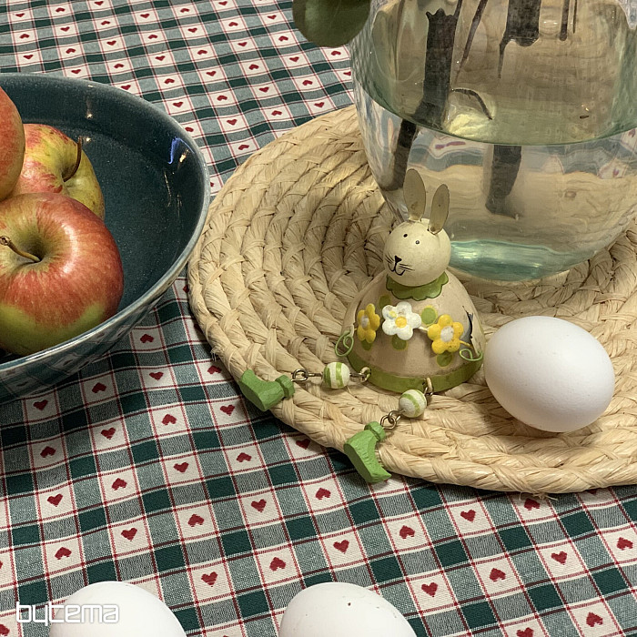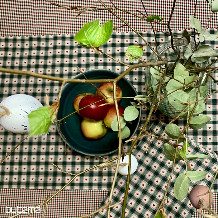 Dekorační ubrus a šál v designu kára a srdíček se skvěle hodí do venkovských chaloupek a roubenek.