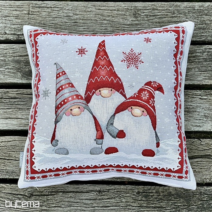 Gobelínové dekorační polštáře s motivem roztomilých skřítků, kteří k vánoční tématice rozhodně patří.