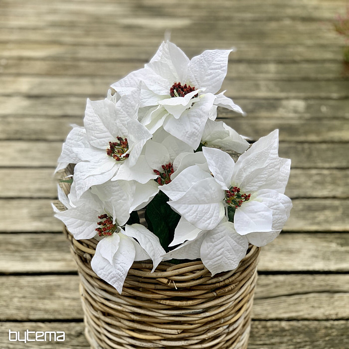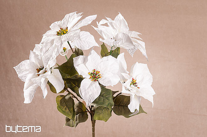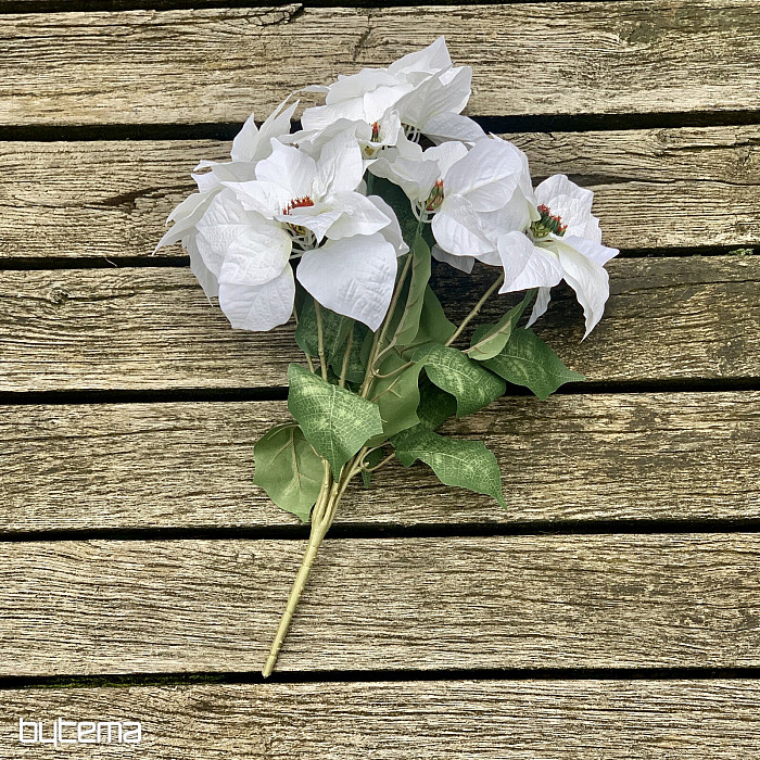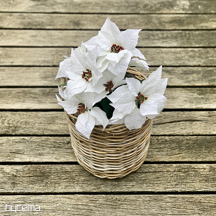 Velká kytice červených květů ve zdařilém provedení. V bohatém trsu je sedm květů a mnoho listů. Květina vypadá velmi přirozeně a díky jejímu pěknému vzhledu získáte působivou dekoraci v období Vánoc.