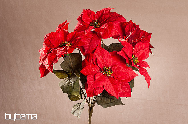 Velká kytice červených květů ve zdařilém provedení. V bohatém trsu je sedm květů a mnoho listů. Květina vypadá velmi přirozeně a díky jejímu pěknému vzhledu získáte působivou dekoraci v období Vánoc.