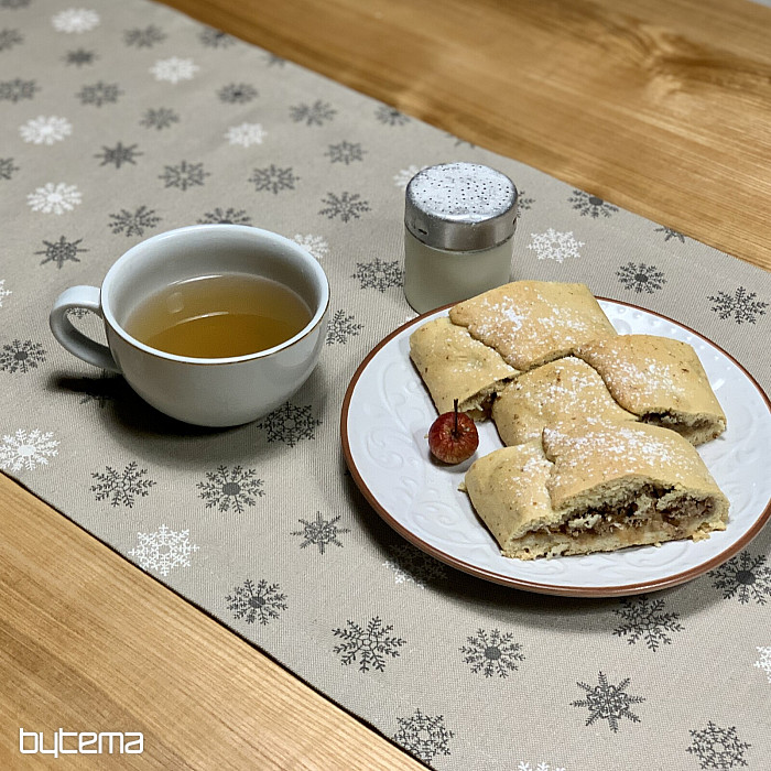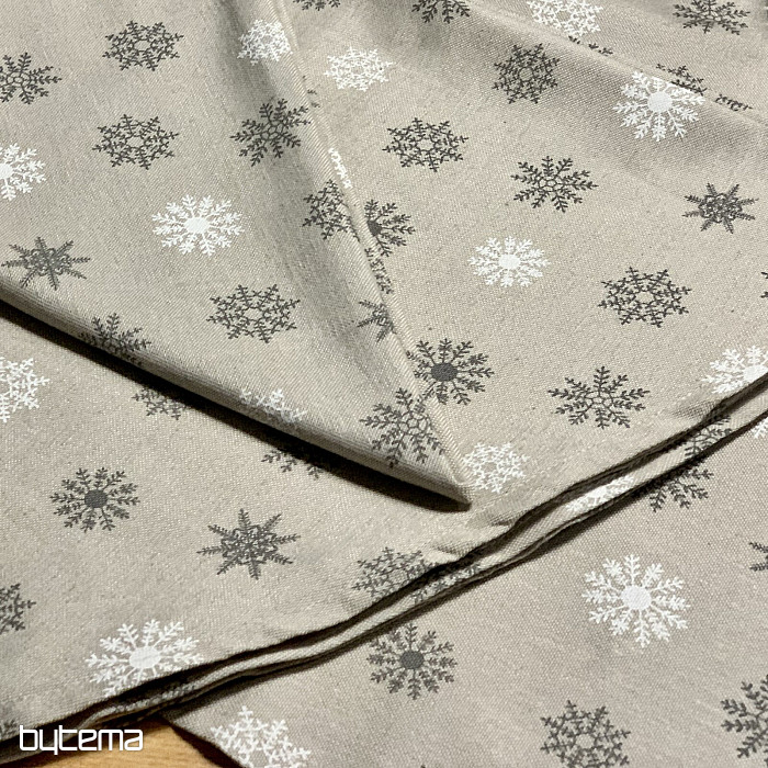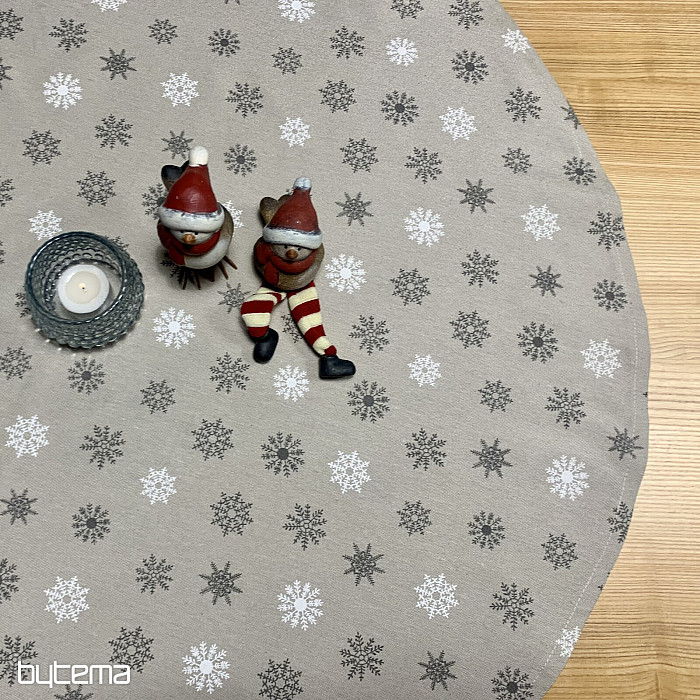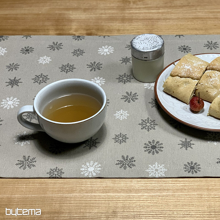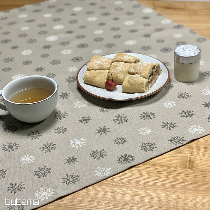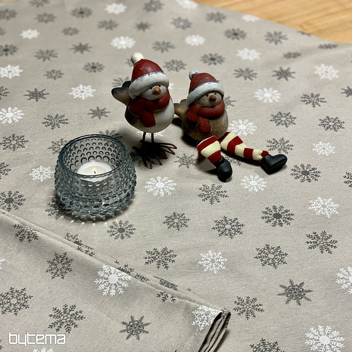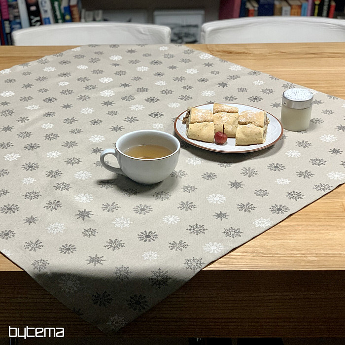 Vánoční dekorační ubrusy a šály s designem krásných velkých i malých bílých a šedých vloček na režném podkladu bude kouzelnou dekorací u vás doma.