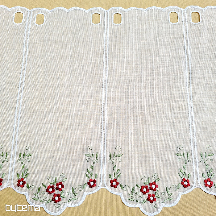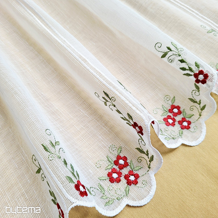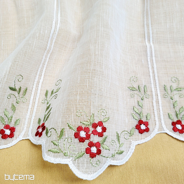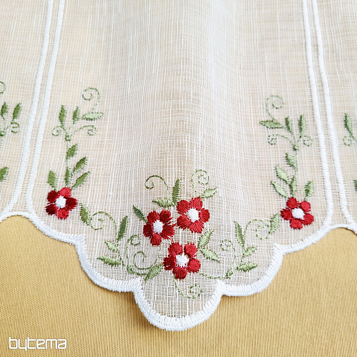 Záclonku nabízíme ve třech výškových rozměrech. Ve výšce 60cm a 90cm má záclonka vyšitou kytičku uprostřed panelu.
