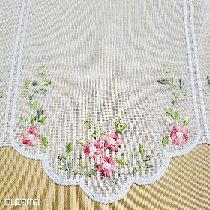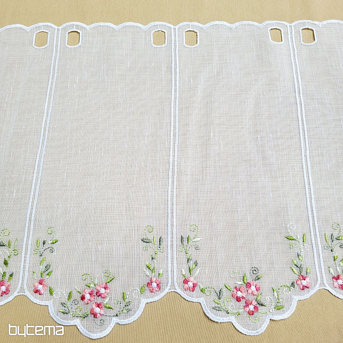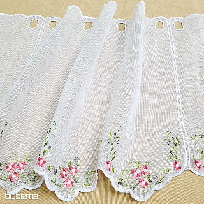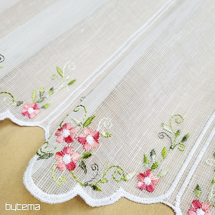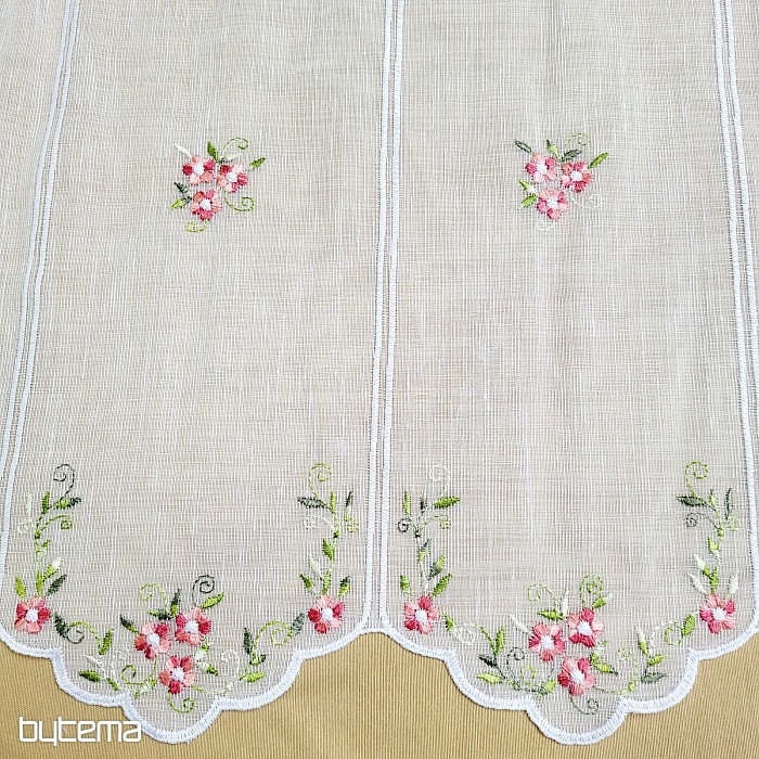 Záclonku nabízíme ve třech výškových rozměrech. Ve výšce 60cm a 90cm má záclonka vyšitou kytičku uprostřed panelu.