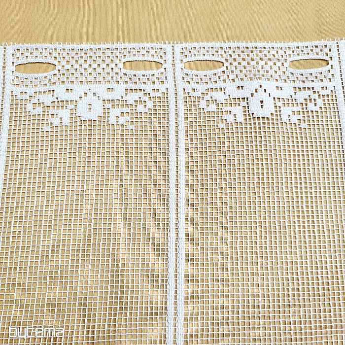 Záclonku nabízíme ve čtyřech výškových rozměrech. Všechny rozměry mají očka k navlečení na vitrážovou tyčku. Záclona je stříhána po panelech, netřeba ji zapošívat.