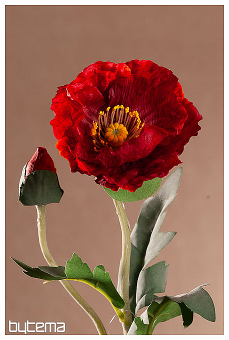 Vlčí mák s červeným květem a jedním poupatem. Na stonku dlouhém 69 cm je několik listů. Květina je svým zpracováním snadno zaměnitelná za tu živou, co roste na loukách a na polích.