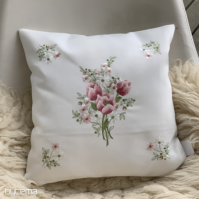 Něžná vyšívaný dekorační povlak s kyticí růžových tulipánů.
