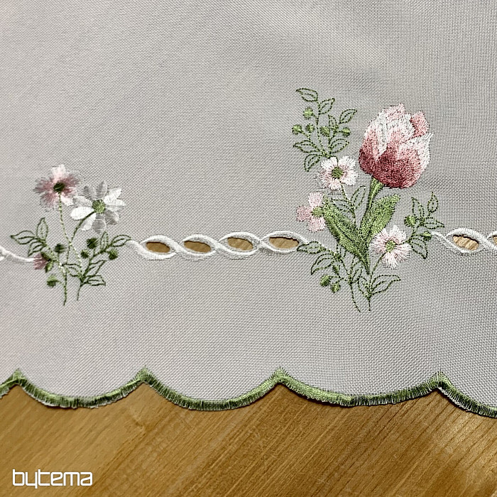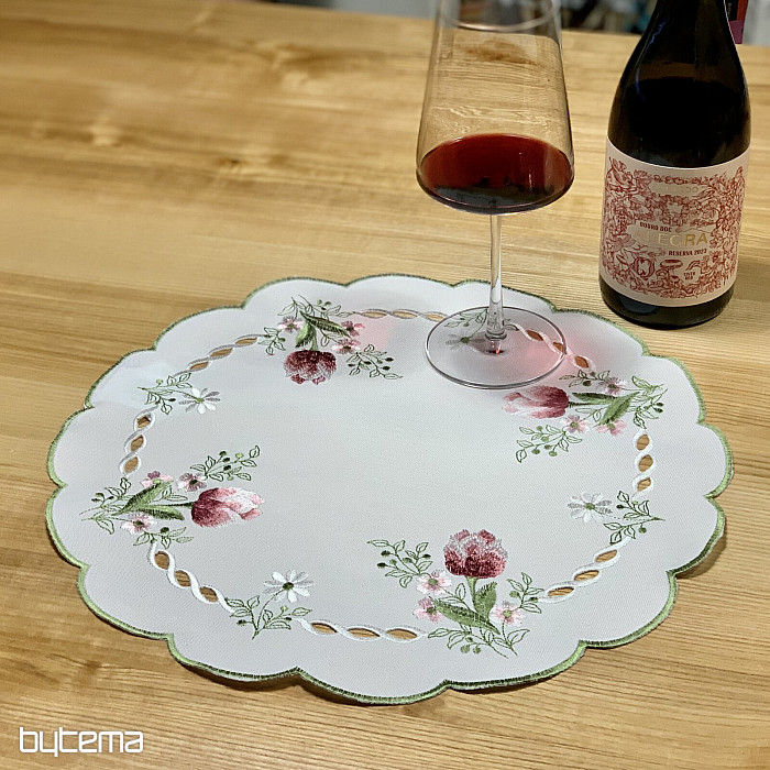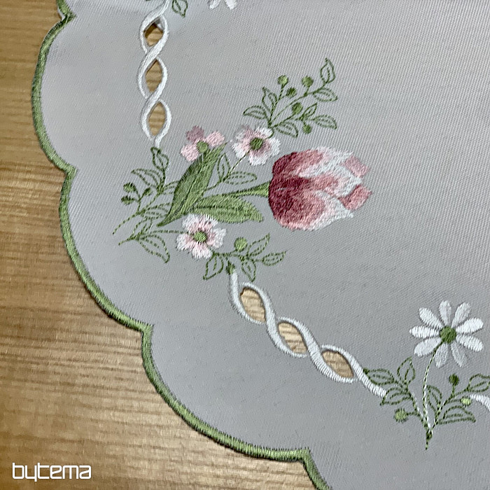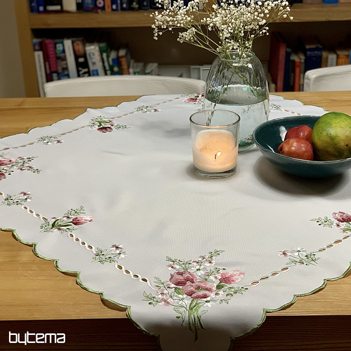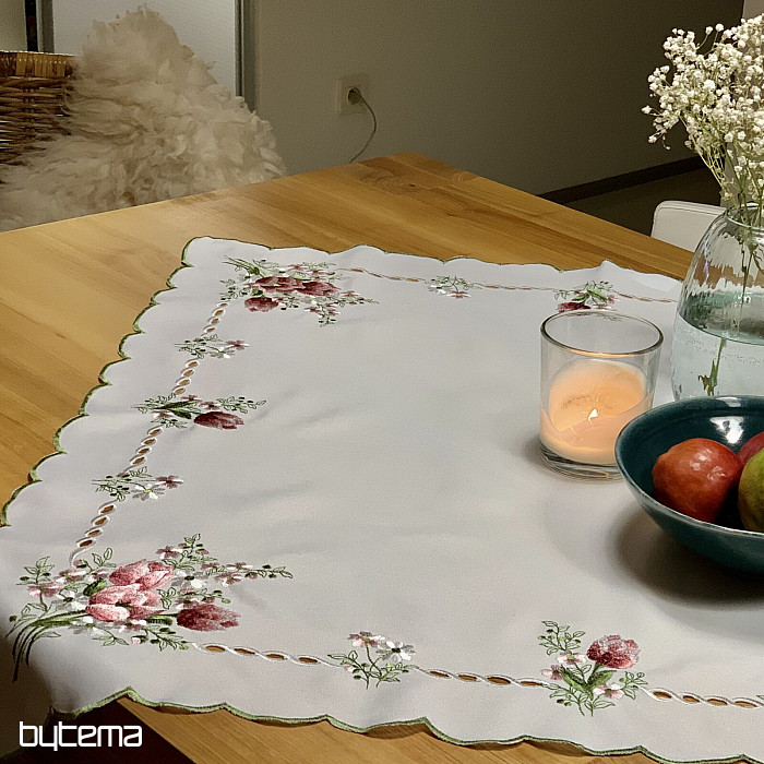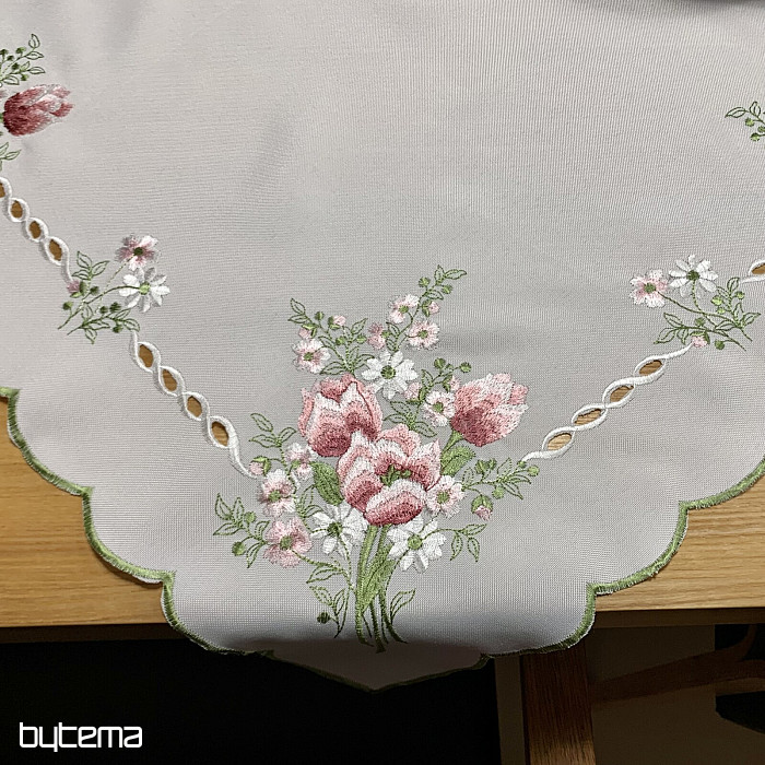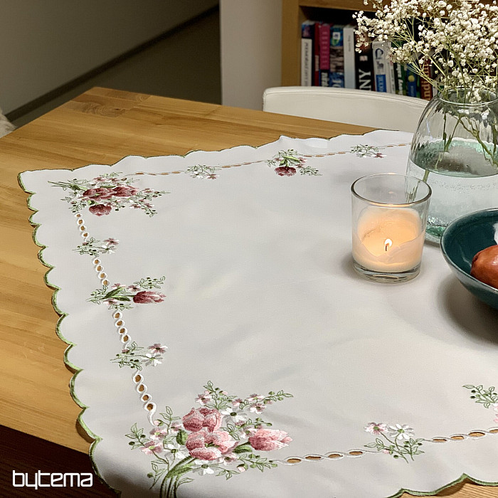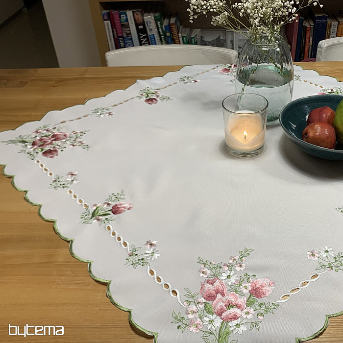 Nádherný vyšívaný ubrus s motivem kytice růžovými tulipány.