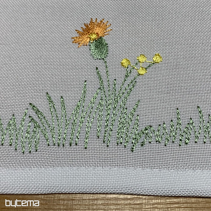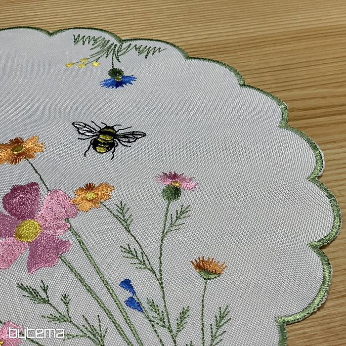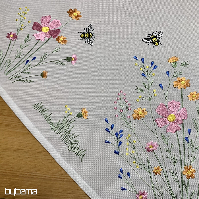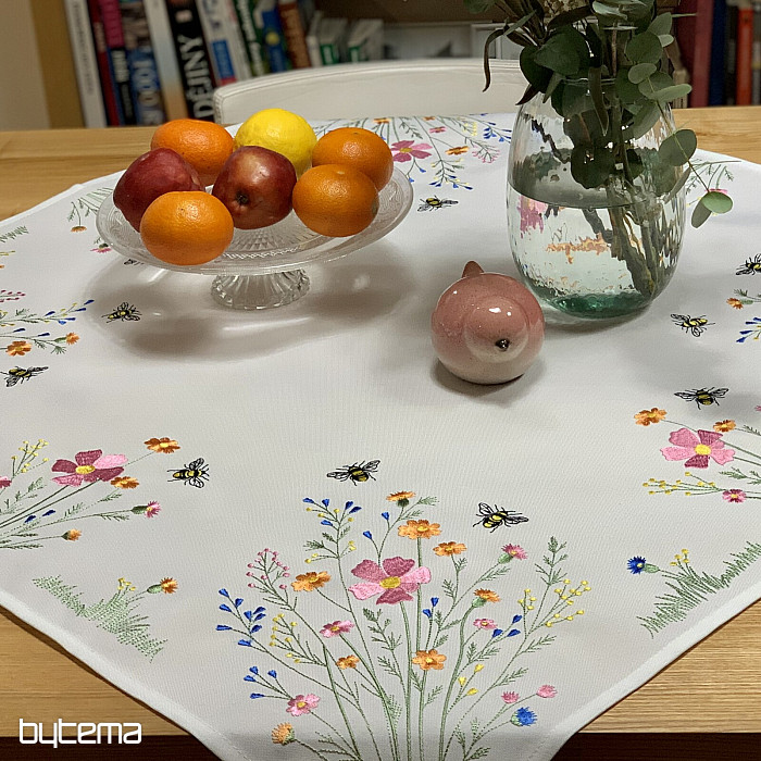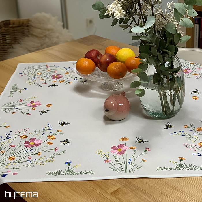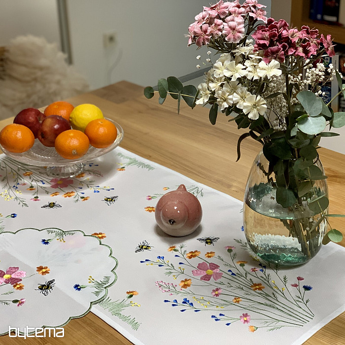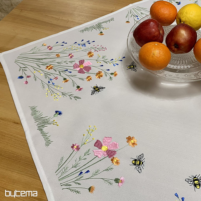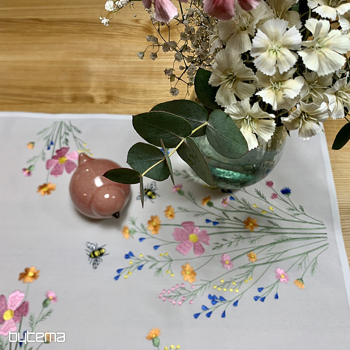 Něžný vyšívaný ubrus a šál s motivem rozkvetlé louky s včeličkami.