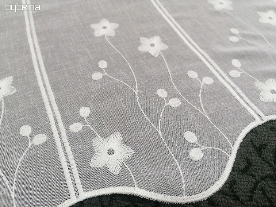 Nádherná vyšívaná bílá záclonka s květy na vitrážku.